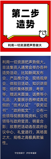 三是以虛假宣傳造勢(shì)。不法分子在宣傳上往往一擲千金,聘請(qǐng)明星代言、名人站臺(tái),在各大廣播電視、網(wǎng)絡(luò)等媒體發(fā)布廣告、在著名報(bào)刊上刊登專訪文章、雇人廣為散發(fā)宣傳單、進(jìn)行社會(huì)捐贈(zèng)等方式,制造虛假聲勢(shì)。