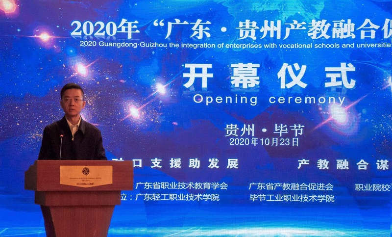 10月23日,廣東?貴州產(chǎn)教融合促進大會在畢節(jié)隆重召開。廣東省教育廳巡視員朱俊文,貴州省教育廳一級巡視員鞠洪出席會議并致辭,畢節(jié)市委常委、副市長胡愛斌致歡迎辭,廣東輕工職業(yè)技術(shù)學(xué)院黨委書記杜安國作介紹,會議由畢節(jié)工業(yè)職業(yè)技術(shù)學(xué)院黨委副書記、院長邱國援全程主持。廣東省教育廳、貴州省教育廳、廣州市教育局、畢節(jié)市教育局相關(guān)負(fù)責(zé)人及參與產(chǎn)教融合大會的校企單位主要負(fù)責(zé)人參加會議。此次會議由廣東省職業(yè)技術(shù)教育學(xué)會、廣東省產(chǎn)教融合促進會、職業(yè)院校協(xié)同發(fā)展聯(lián)盟主辦,廣東輕工職業(yè)技術(shù)學(xué)院、畢節(jié)工業(yè)職業(yè)技術(shù)學(xué)院承辦。