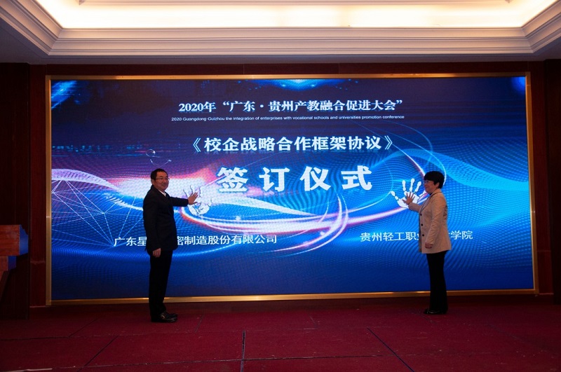 會上,廣東省向貴州職業(yè)院校捐贈阿里云智慧校園3.0系統(tǒng),廣州市億科計算機公司向畢節(jié)工業(yè)職業(yè)技術(shù)學(xué)院捐贈智慧黨建系統(tǒng);相關(guān)企業(yè)與院校簽訂人才專業(yè)培養(yǎng)、訂單班、校企戰(zhàn)略合作、產(chǎn)教融合項目20余項。廣東星徽精密制造股份有限公司代表參會企業(yè)進行發(fā)言,10余家企業(yè)進行了產(chǎn)教融合案例分享。