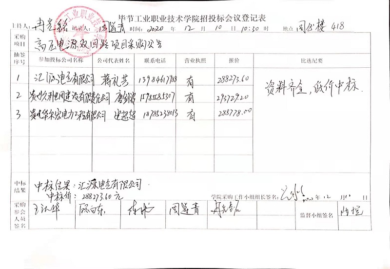 畢節(jié)工業(yè)職業(yè)技術(shù)學(xué)院高壓電源雙回路采購項(xiàng)目中標(biāo)公告