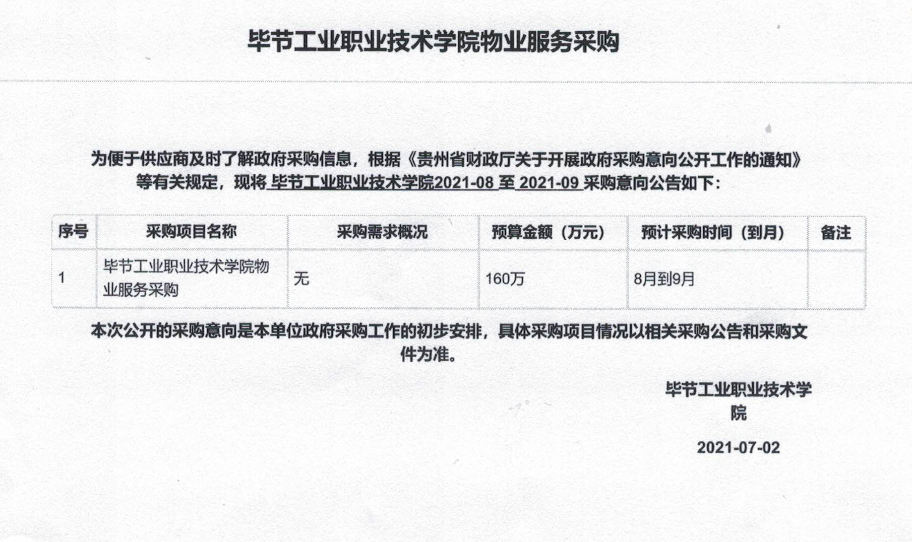 畢節(jié)工業(yè)職業(yè)技術學院物業(yè)服務采購公告