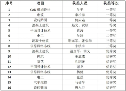 近年來(lái),我院一直注重發(fā)揮技能大賽在促進(jìn)“三教”改革,提升人才培養(yǎng)質(zhì)量中的引領(lǐng)作用,不斷完善人培方案和人才培養(yǎng)體系,加強(qiáng)以賽促教、以賽促學(xué)、以賽促訓(xùn)、以賽促建,有效促進(jìn)了產(chǎn)教深度融合發(fā)展、校企密切合作育人,職業(yè)教育培養(yǎng)質(zhì)量顯著提升。 (頒獎(jiǎng)現(xiàn)場(chǎng)) 本次比賽榮獲佳績(jī),進(jìn)一步激發(fā)了我院師生學(xué)習(xí)技術(shù)、鉆研業(yè)務(wù)的熱情,多層次促進(jìn)了師生整體素質(zhì)和技能水平的提升。 (我院部分獲獎(jiǎng)師生合影) 今后,我院將再接再厲,努力打造一支技藝精湛、素質(zhì)良好的人才隊(duì)伍,為今后的各級(jí)技能大賽作準(zhǔn)備,為畢節(jié)市經(jīng)濟(jì)社會(huì)高質(zhì)量發(fā)展提供有力的技能人才支撐。 (我院獲獎(jiǎng)情況一覽表)