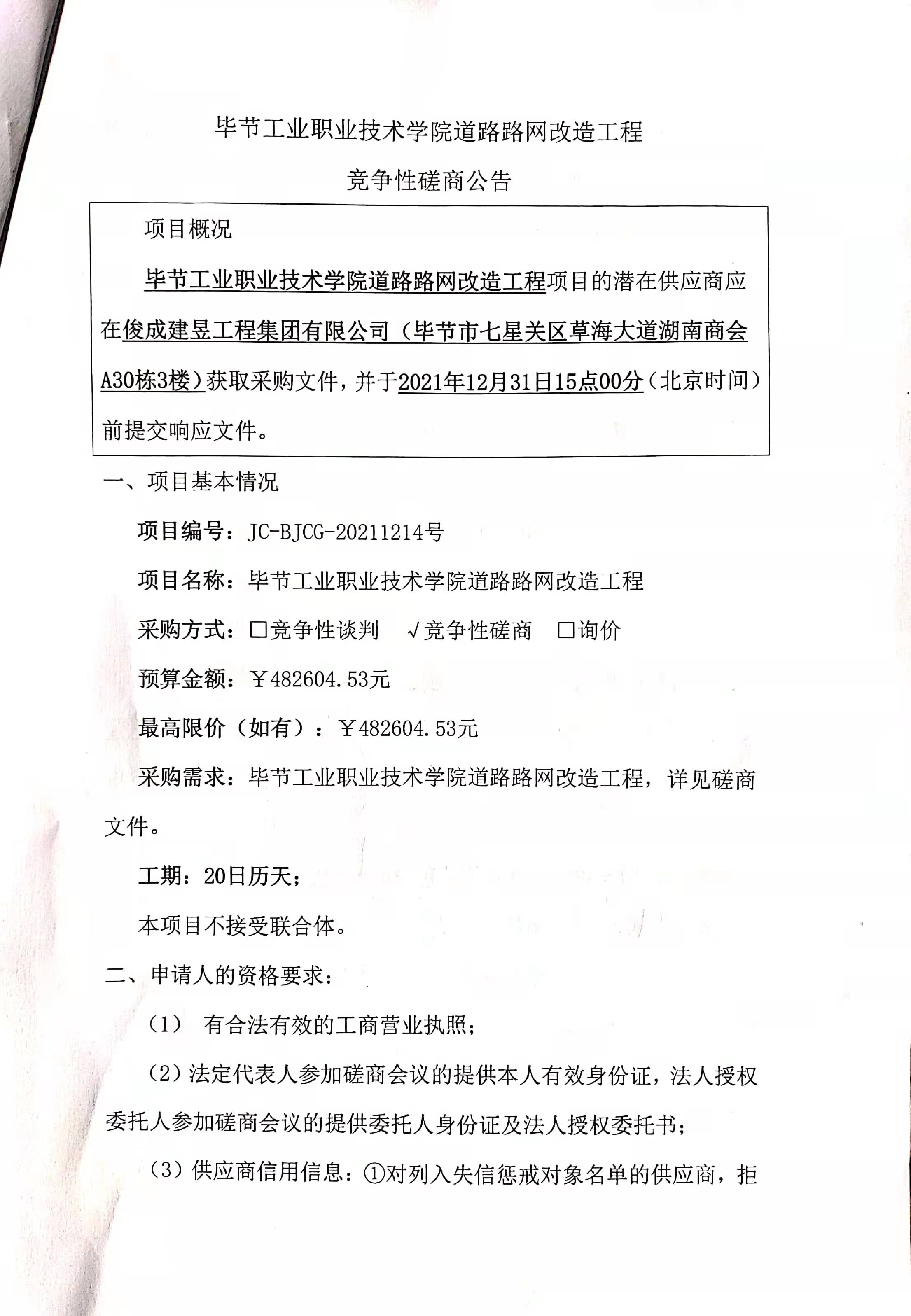 畢節(jié)工業(yè)職業(yè)技術學院道路路網(wǎng)改造工程競爭性磋商公告