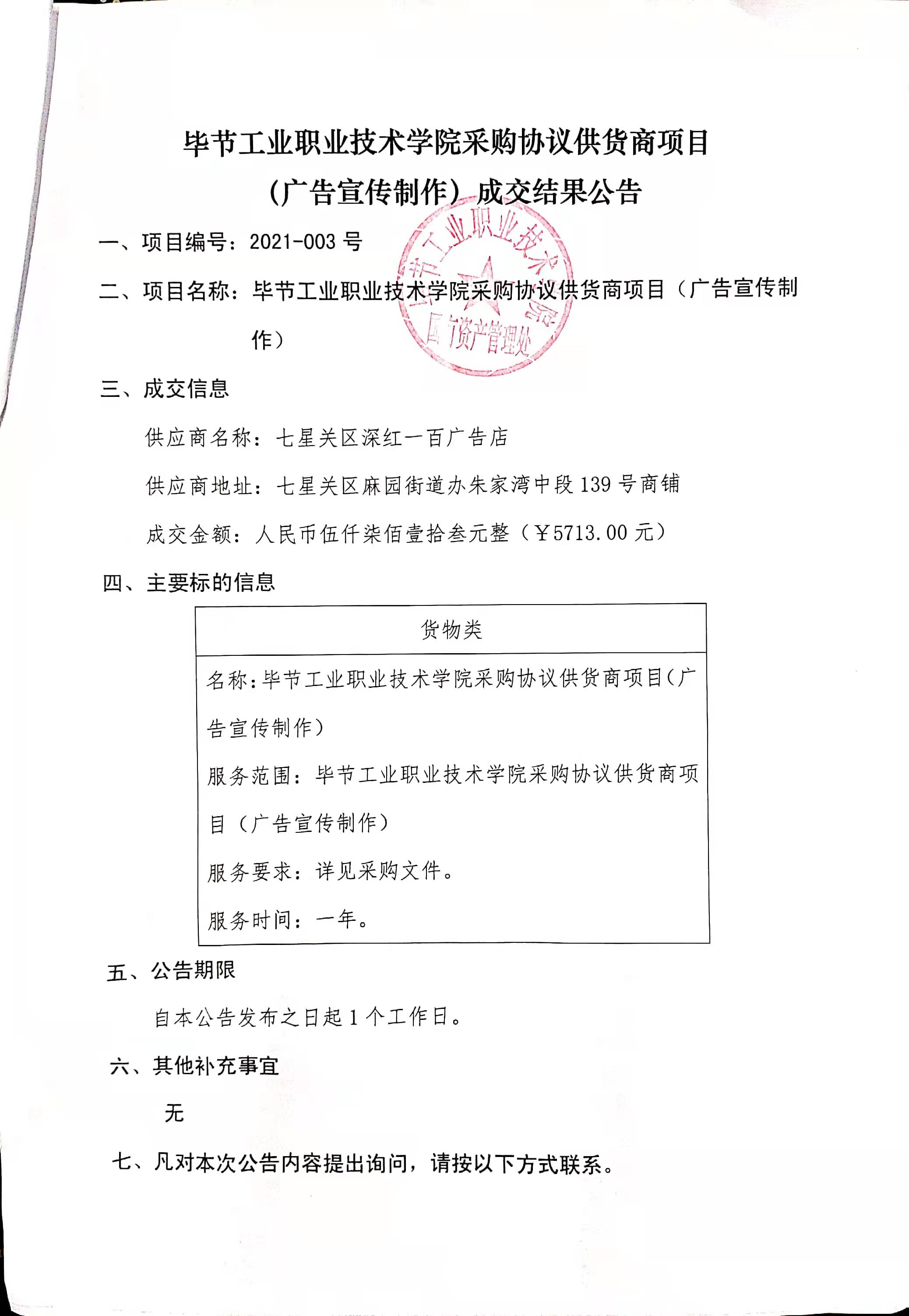 畢節(jié)工業(yè)職業(yè)技術(shù)學(xué)院采購協(xié)議供貨商項(xiàng)目(廣告宣傳制作)成交結(jié)果公告