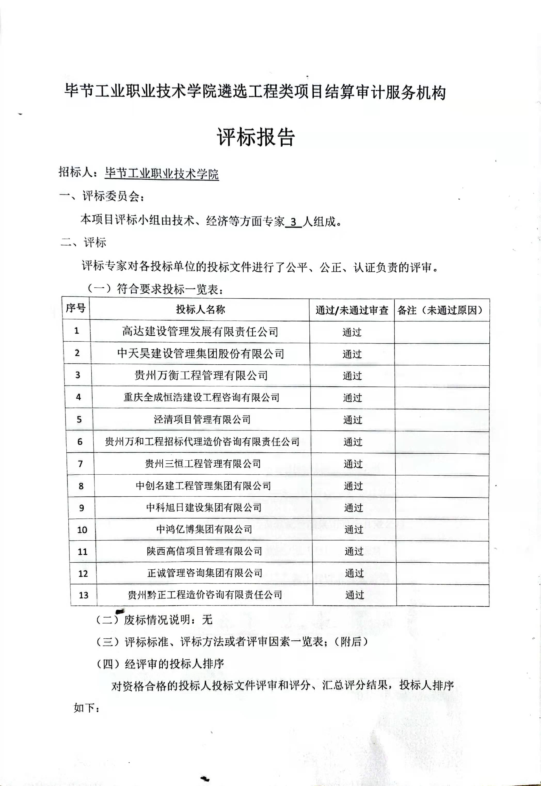 畢節(jié)工業(yè)職業(yè)技術學院遴選工程類項目結算審計服務機構評價報告