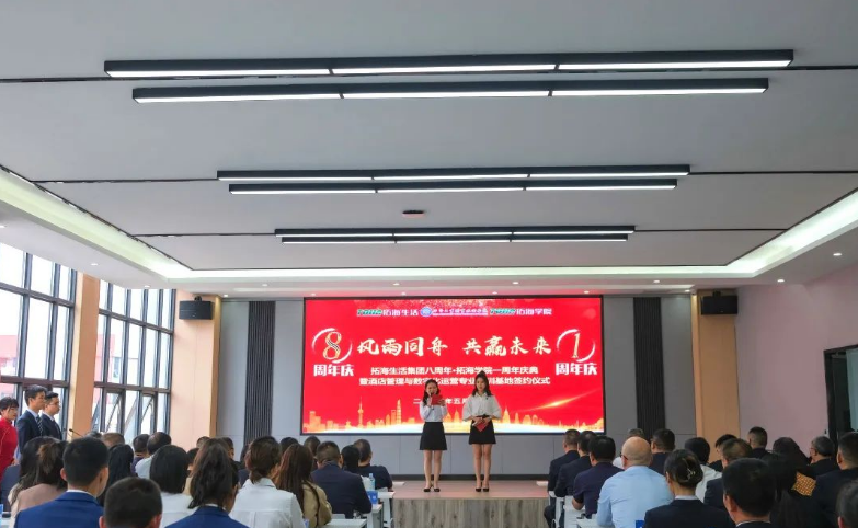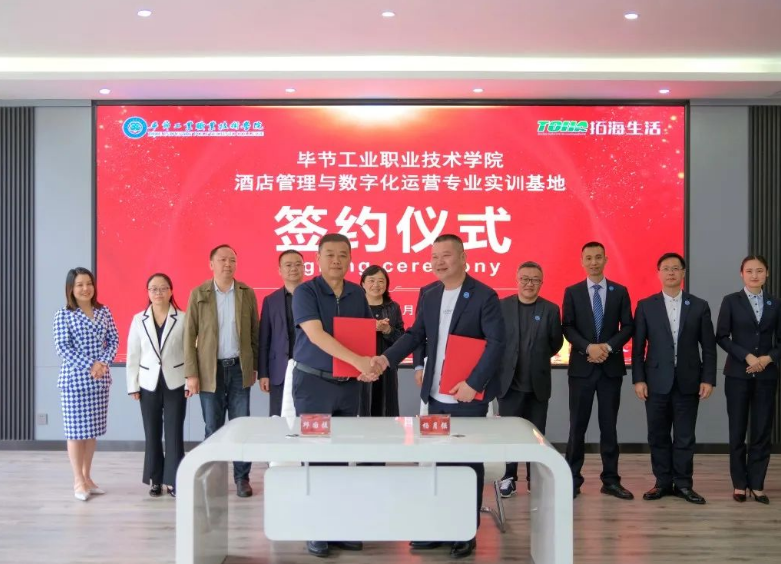 5月12日,畢節(jié)工業(yè)職業(yè)技術(shù)學(xué)院拓海學(xué)院一周年成立儀式暨畢節(jié)工業(yè)職業(yè)技術(shù)學(xué)院酒店管理與數(shù)字化運(yùn)營專業(yè)實(shí)訓(xùn)基地簽約儀式在拓海學(xué)院會議室舉行。學(xué)院黨委副書記、院長邱國援,黨委委員、副院長黃瑛、黃河、吳家文、黃文碧,拓海學(xué)院名譽(yù)院長、拓海生活集團(tuán)總裁楊月強(qiáng),拓海學(xué)院院長林彬出席儀式,拓海集團(tuán)相關(guān)領(lǐng)導(dǎo)、員工代表及學(xué)院社會服務(wù)系師生代表參加儀式。 儀式現(xiàn)場 邱國援在致辭中指出,校企雙方共建拓海學(xué)院實(shí)訓(xùn)基地,為相關(guān)專業(yè)學(xué)生提供了理實(shí)一體化教學(xué)場地和實(shí)習(xí)實(shí)訓(xùn)平臺,改善了物業(yè)管理、酒店管理等專業(yè)的教學(xué)、實(shí)訓(xùn)條件,使我院辦學(xué)條件、人才培養(yǎng)體系和教學(xué)質(zhì)量得到不斷提高。同時(shí),拓海集團(tuán)積極參與物業(yè)管理專業(yè)人才培養(yǎng)方案修訂,從行業(yè)、企業(yè)角度提出了很多人才培養(yǎng)的意見建議,邀請行業(yè)專家來校講學(xué),親自授課,使學(xué)生專業(yè)知識得到有力提升,使物業(yè)管理專業(yè)人才培養(yǎng)體系更加符合行業(yè)需求。下一步,希望校企雙方繼續(xù)深化校企合作機(jī)制、持續(xù)擴(kuò)大合作范圍、協(xié)同提升合作質(zhì)量,充分發(fā)揮拓海生活服務(wù)集團(tuán)在物業(yè)管理方面的專業(yè)優(yōu)勢,在人才培養(yǎng)方案、課程教學(xué)、實(shí)習(xí)實(shí)訓(xùn)、教師培養(yǎng)等方面提供企業(yè)建議和技術(shù)指導(dǎo),在教育教學(xué)、學(xué)生管理、素質(zhì)培養(yǎng)、技能提升等方面與學(xué)院交換經(jīng)驗(yàn),提升教師專業(yè)素質(zhì),強(qiáng)化學(xué)生技能提升,推進(jìn)“工學(xué)結(jié)合”教學(xué)模式,共同提高學(xué)院育人質(zhì)量。 邱國援在儀式上致辭 楊月強(qiáng)表示,過去一年,校企雙方本著優(yōu)勢互補(bǔ)、資源共享、互惠雙贏、共同發(fā)展的原則,對校企合作模式進(jìn)行了深層次的探索、創(chuàng)新與實(shí)踐,拓海學(xué)院的成立不僅推動了產(chǎn)教融合,也為學(xué)生提供了優(yōu)質(zhì)的實(shí)訓(xùn)基地,為企業(yè)提供了強(qiáng)有力的人才保障。下一步,企業(yè)將繼續(xù)聯(lián)手學(xué)院不斷創(chuàng)新,共同培養(yǎng)高素質(zhì)技術(shù)技能型人才,構(gòu)建校企合作雙贏局面,助推職業(yè)教育改革和地方經(jīng)濟(jì)社會高質(zhì)量發(fā)展。 楊月強(qiáng)在儀式上講話 儀式上,邱國援代表學(xué)院與拓海生活集團(tuán)簽訂了《畢節(jié)工業(yè)職業(yè)技術(shù)學(xué)院酒店管理與數(shù)字化運(yùn)營專業(yè)實(shí)訓(xùn)基地(中心)建設(shè)合作協(xié)議》。學(xué)院與拓海生活集團(tuán)將再次攜手,共建畢節(jié)工業(yè)職業(yè)技術(shù)學(xué)院酒店管理與數(shù)字化運(yùn)營專業(yè)實(shí)訓(xùn)基地,共同承擔(dān)科研項(xiàng)目、實(shí)現(xiàn)信息共享,培養(yǎng)更多高質(zhì)量的技能人才,為畢節(jié)全面推進(jìn)鄉(xiāng)村振興提供有力的人才支撐。 簽約儀式現(xiàn)場 拓海學(xué)院院長林斌、社會服務(wù)系主任呂振欣為優(yōu)秀學(xué)生羅達(dá)麗、李定奎頒發(fā)榮譽(yù)證書 優(yōu)秀學(xué)生代表羅達(dá)麗發(fā)言 儀式中的精彩節(jié)目