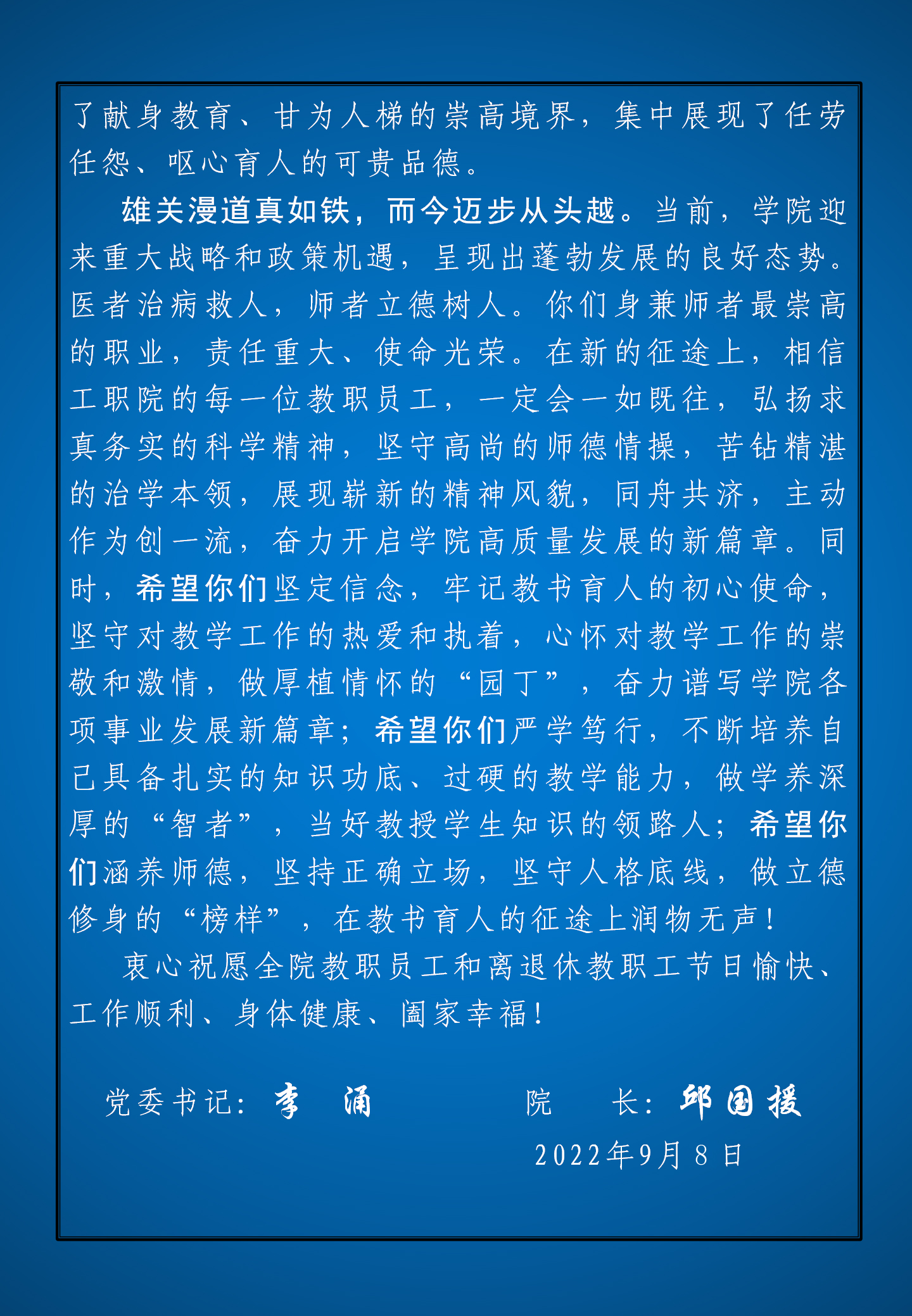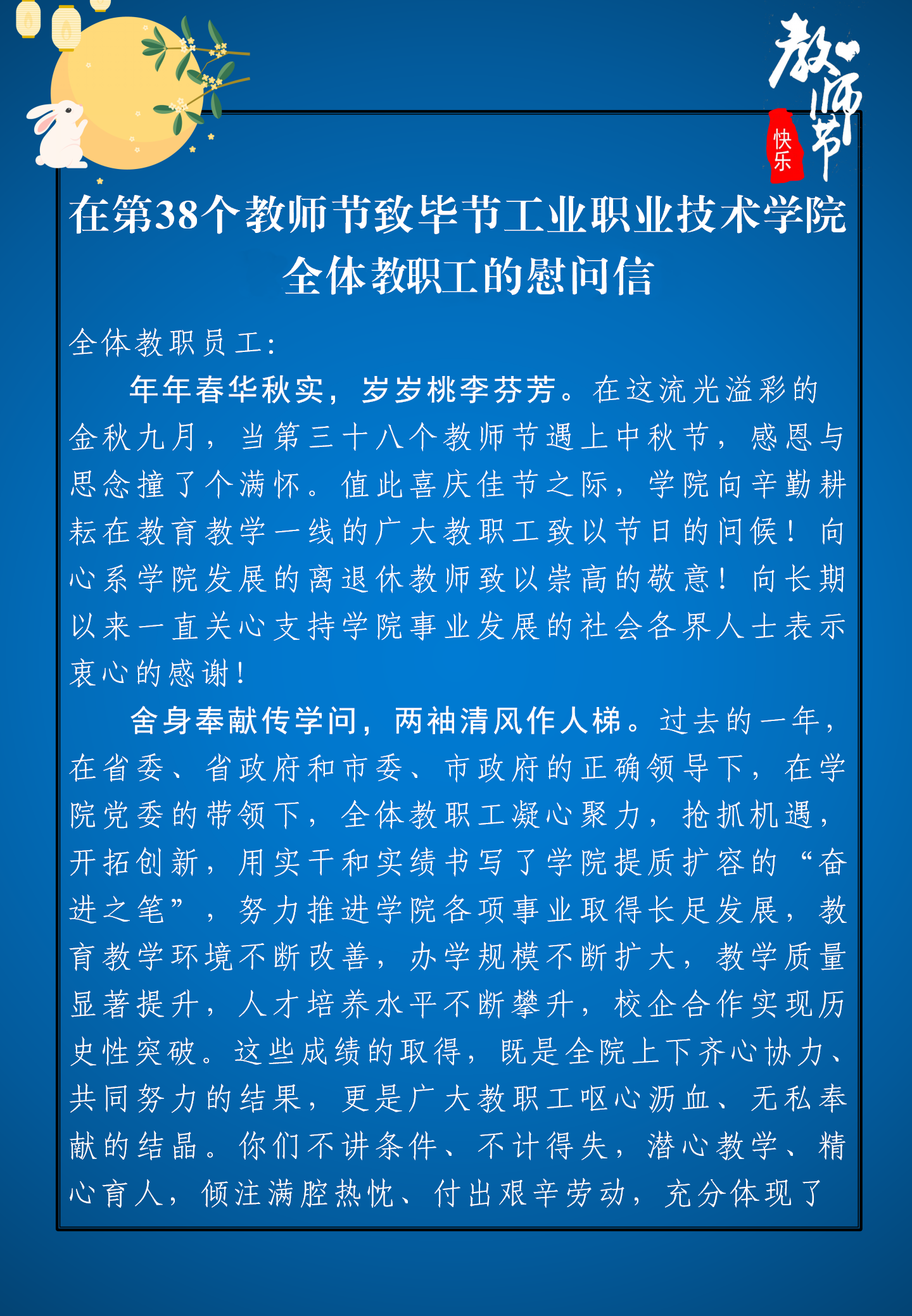 在第38個教師節(jié)致畢節(jié)工業(yè)職業(yè)技術(shù)學(xué)院全體教職工的慰問信