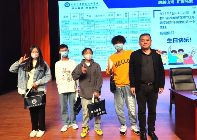 10月29日至11月1日,畢節(jié)工業(yè)職業(yè)技術(shù)學(xué)院迎來了近3000名“小可愛”。在11月2日-3日開展的“開學(xué)第一課“上,學(xué)院黨委副書記、院長邱國援為過生日的16位同學(xué)送上了一份精心準(zhǔn)備的禮物,通過別樣的祝福引導(dǎo)新同學(xué)扣好人生的“第一??圩印?,讓他們在充滿驚喜和愉悅的氣氛下度過了進(jìn)入畢節(jié)工職院的第一個特別的生日。