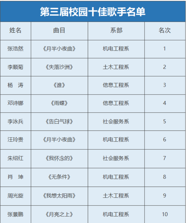 (活動現(xiàn)場) 音符在旋律中跳動 歌聲在校園里蔓延 青春的汗水在舞臺上揮灑 夢想的聲音在賽場上飄蕩 這是一個用青春與夢想搭建的舞臺 這是一個充滿激情與才華的音樂盛會 (十佳歌手展示) 此次十佳歌手大賽 展示了我院學生的青春風采 豐富了學子們的課余生活 更營造出了積極向上的校園氛圍 (活動現(xiàn)場) 經(jīng)過在場評委的公正評選 第三屆十佳歌手已然誕生 讓我們恭喜這些在此次大賽中 脫穎而出的工職院青年們 他們用自己的青春熱血 詮釋了學院充滿活力的一幕