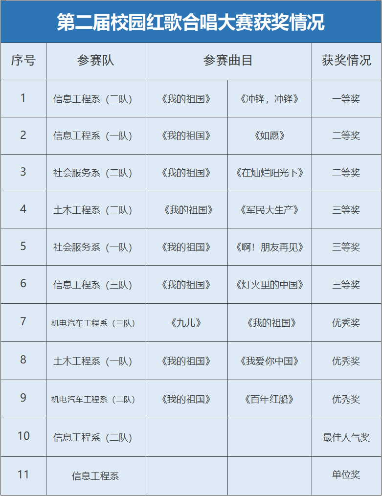 5月31日晚 學(xué)院多功能廳 上演了一場 精彩的紅歌合唱大賽 (信息工程系一隊) (社會服務(wù)系二隊) (土木工程系二隊) (社會服務(wù)系一隊) (信息工程系三隊) (機電汽車工程系三隊) (土木工程系一隊) (機電汽車工程系二隊) 雄渾的歌聲 整齊的隊伍 一個個滿腔熱血的學(xué)子 展現(xiàn)著積極昂揚的風(fēng)貌 一曲曲波瀾起伏的合唱 唱出了祖國胸懷之豪邁 他們用充滿激情的歌聲 詮釋了工職院學(xué)子 青春的熱血和飽滿的精神 此次大賽的成功舉辦 不僅豐富了同學(xué)們的文化生活 更在整個校園形成了 愛黨愛國的濃厚氛圍 最后 在評委們公正公平的評選下 誕生了此次大賽的各個獎項
