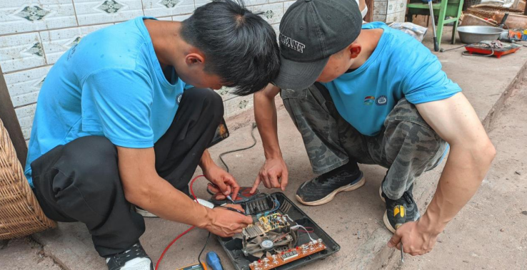 圖為實(shí)踐小隊隊員為村民維修電磁爐