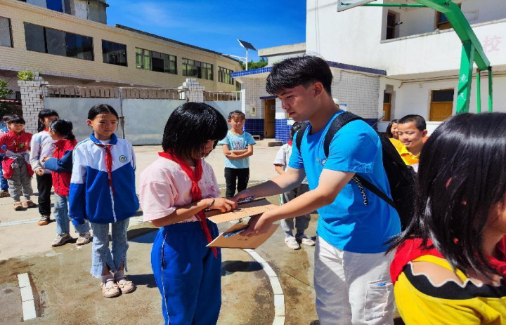 圖為實(shí)踐隊成員給小朋友送上學(xué)習(xí)用品