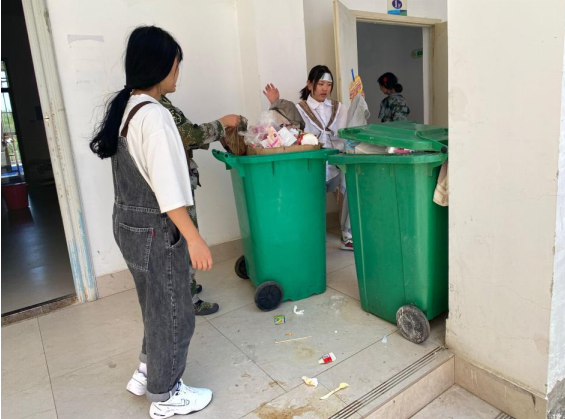 2021年9月2日中午,第三教學(xué)黨支部的黨員教師做好帶頭作用,親自清掃各樓層垃圾滿溢的垃圾桶,和學(xué)生一起到垃圾回收點(diǎn)倒垃圾。