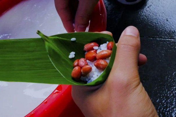 看著同學(xué)們嫻熟的手法,捻起一片粽葉,三兩下卷成漏斗狀,再舀起一勺米和紅棗倒入粽葉中,隨后用粽葉把糯米包裹緊實,系上繩子,一顆顆肥碩的粽子就這樣完成了。