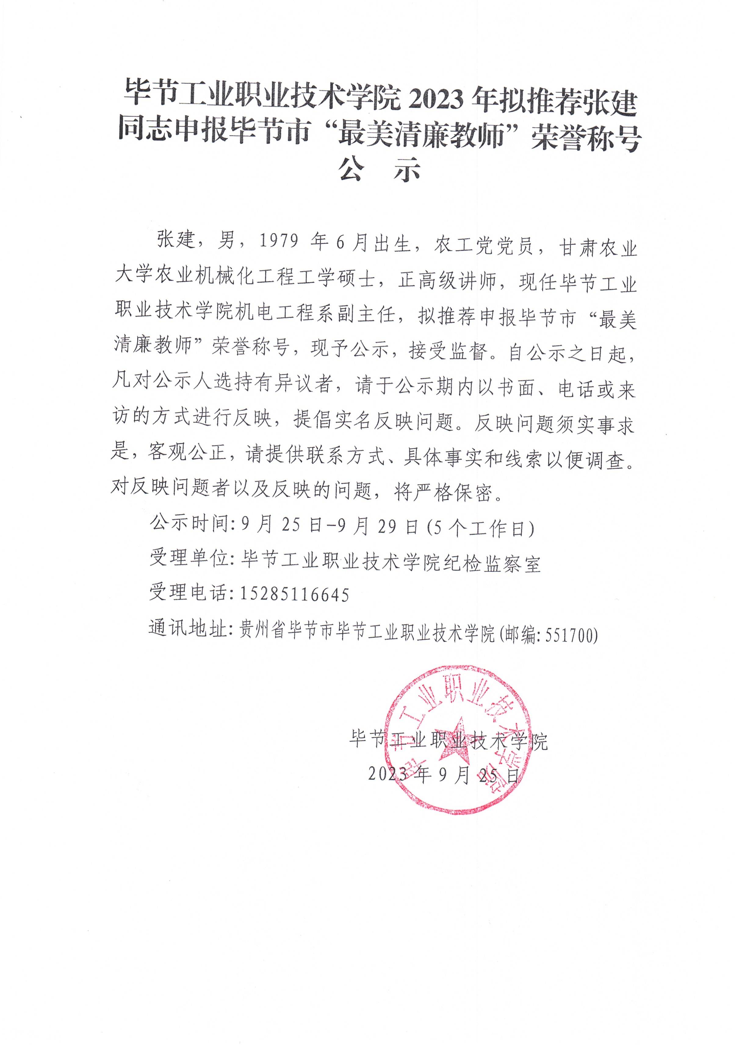 畢節(jié)工業(yè)職業(yè)技術學院2023年擬推薦張建同志申報畢節(jié)市“最美清廉教師”榮譽稱號公示