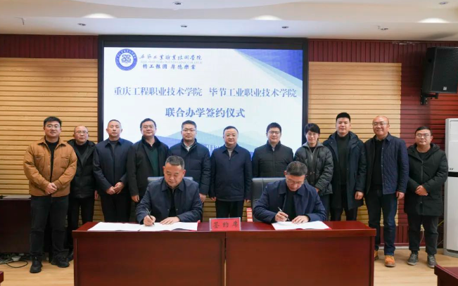 1月12日,重慶工程職業(yè)技術(shù)學(xué)院、畢節(jié)工業(yè)職業(yè)技術(shù)學(xué)院聯(lián)合辦學(xué)工作洽談會及校校合作、聯(lián)合辦學(xué)簽約儀式在我院同心樓第三會議室舉行。重慶工程職業(yè)技術(shù)學(xué)院黨委副書記、院長張進(jìn),畢節(jié)工業(yè)職業(yè)技術(shù)學(xué)院黨委書記李涌,黨委副書記、院長邱國援,黨委委員、副院長吳家文出席會議,兩校相關(guān)部門負(fù)責(zé)同志參加會議。