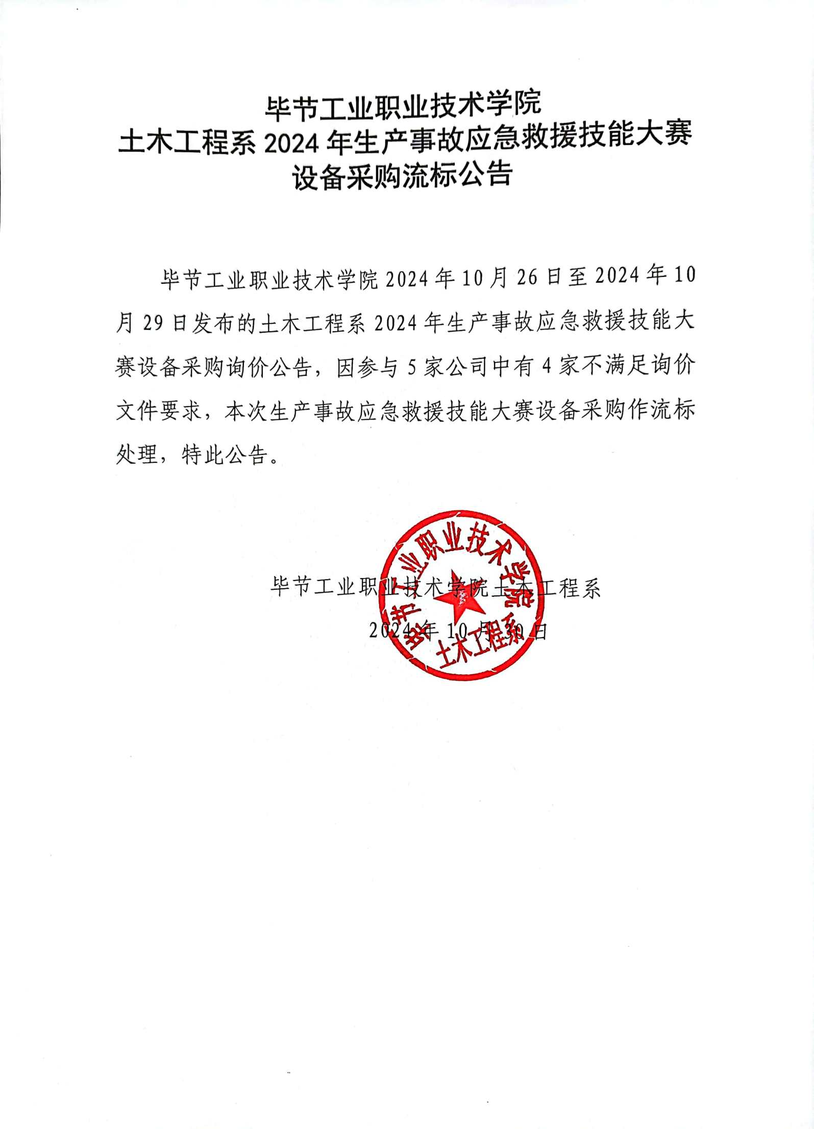 畢節(jié)工業(yè)職業(yè)技術學院土木工程系2024年生產事故應急救援技能大賽設備采購流標公告