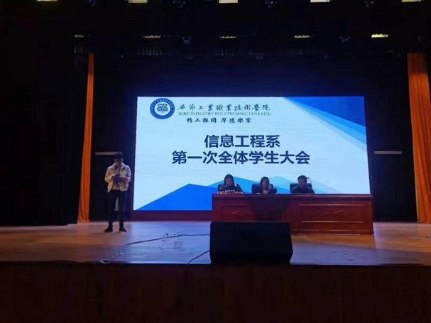 為進一步加強系部管理與建設,畢節(jié)工業(yè)職業(yè)技術學院信息工程系于2019年12月19日在學院會議中心召開學生大會,到場的有信息工程系負責人黃亞男,系學生科胡蓉、潘愚老師、各班班主任及信息工程系全體學生。